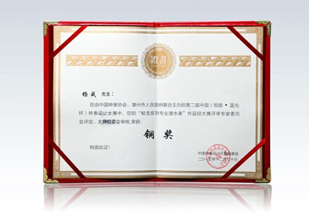 2015年12月21日,国内最具权威的中国钟表设计奖项——中国蓝光杯钟表设计大赛颁奖典礼在福建·漳州隆重举行。中国钟表协会、漳州市人民政府、龙文区人民政府等相关领导为获奖选手进行现场颁奖。整个颁奖典礼热烈隆重,获奖作品一次又一次震撼了与会嘉宾,赢得了现场嘉宾阵阵掌声。