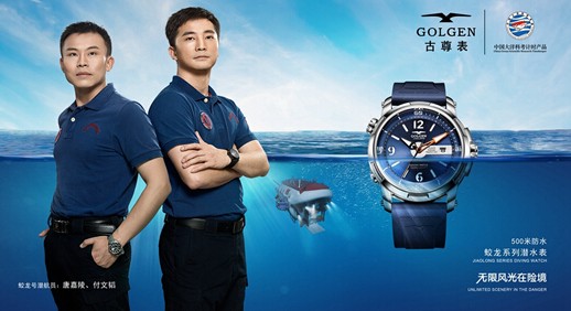 图5(古尊表代言人“蛟龙号”潜航员付文韬、唐嘉陵与蛟龙系列潜水表)