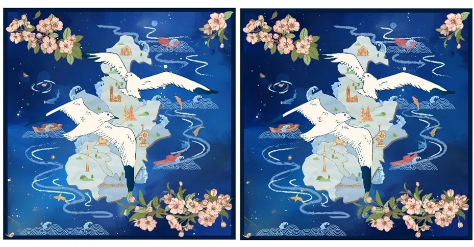 《丝巾》的主色调选用蓝色,九河下梢天津卫屹立渤海之滨,湛蓝的大海与母亲河海河是天津这座城市的底色。在天津不仅有美食的吃、曲艺的哏儿,还有很多不同的建筑来展现天津的“贵”,这个“贵”是高贵典雅的贵。解放桥、世纪钟、天塔、西开教堂、五大道钟楼、天津之眼这些天津城市地标让这条丝巾不仅是丝巾,更是一张绝妙的天津城市拍照打卡路线图,俯瞰城市的两只海鸥不仅是海河上方的独特风光,更是海鸥代表天津制造业历史与发展的名片。翱翔海鸥俯瞰天津城市变迁,用极富东方美感的丝巾设计呈现天津城市历史文化、建筑文化、工业文化以及这座城市的优雅与迷人。