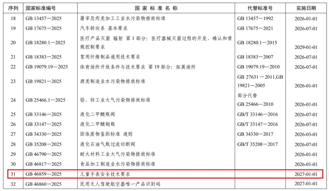 2025年12月2日,国家市场监督管理总局(国家标准化管理委员会)发布2025年第32号公告,批准发布了34项强制性国家标准,其中包括强制性国家标准GB 46859-2025《儿童手表安全技术要求》,该标准将于2027年01月01日起实施,请各相关单位积极关注标准内容,确保产品符合国标要求。