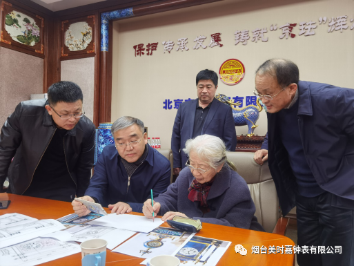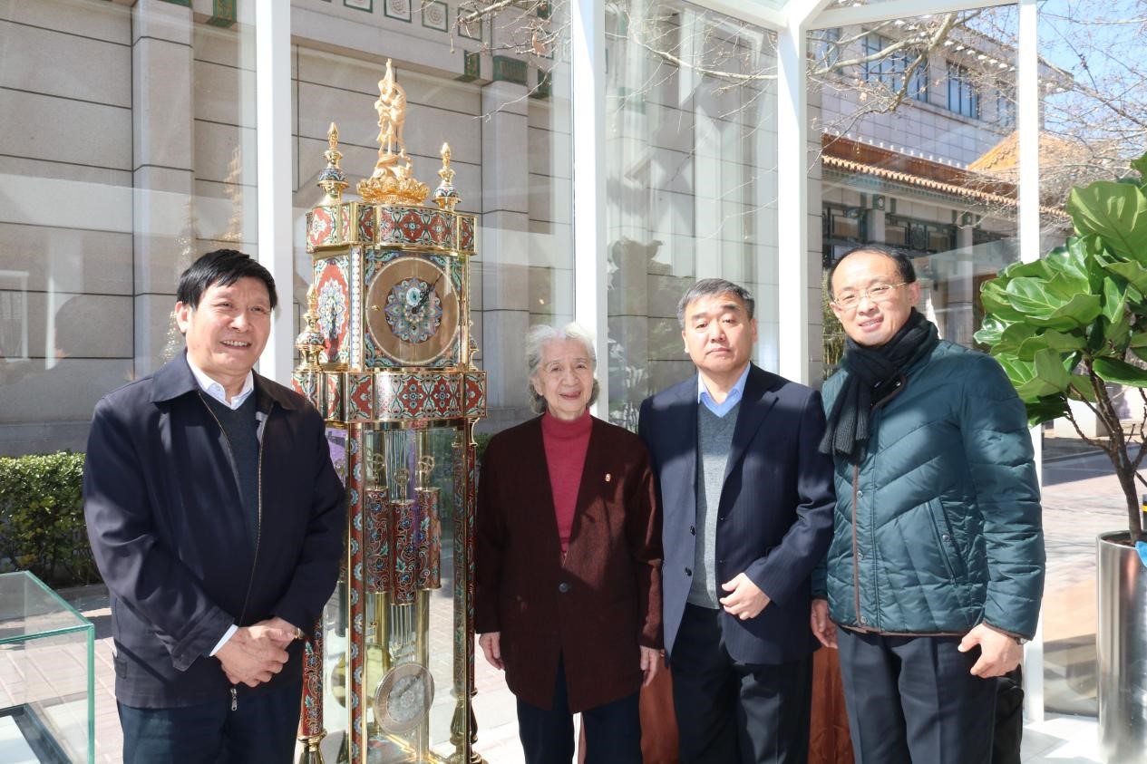 常沙娜先生(右二)、钟连盛大师(左二)、李爱国董事长(右一)、高力(左一)在北京市珐琅厂会议室共同研发景泰蓝与钟表创新融合作品。