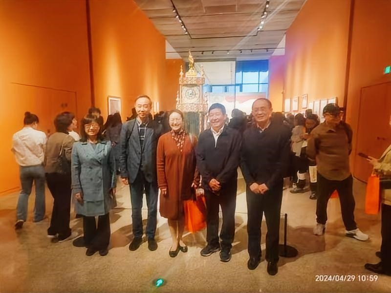 合影:常沙娜先生(左二)、钟连盛大师(右二)、衣福成先生(左一)、李爱国董事长(右一)