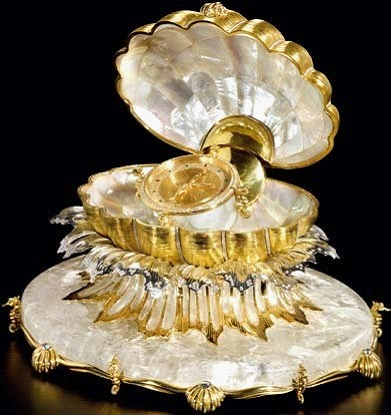 《金贝与珍珠》座台钟,百达翡丽,1991年 编号: Lot2540/Sale HK0460 估价:350万-550万港元 成交价:1144万港元 拍卖时间:2013年4月7日 拍卖行:香港苏富比 高18cm,宽31cm 2055型号博物馆等级极精致22K及18K黄金及银、珠母贝、钻石、祖母绿、红宝石、海水蓝宝及水晶座台钟。水晶石为底座,环绕黄金海马和贝壳装饰。黄金打造牡蛎壳,镶嵌白金及钻石,内层装饰珠母贝。打开牡蛎壳表盘和机芯装置置于球体珍珠内,以精细的扇形珠母贝镶嵌物装饰,4条黄金雕刻的海马置于刻度。机芯编号8457,外壳编号2914655。