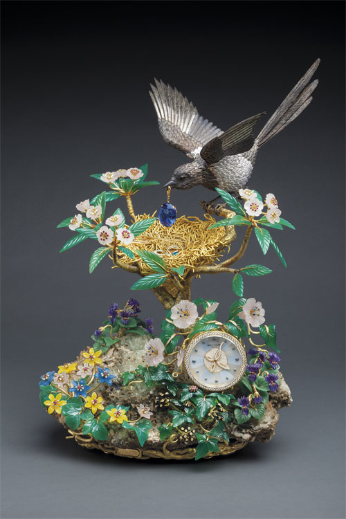 《喜鹊聚宝鸟巢》座台钟,百达翡丽,1992年 编号:Lot2542/Sale HK0460 估价:300万-500万港元 成交价:1804万港元 拍卖时间:2013年4月7日 拍卖行:香港苏富比 52cm×34cm×27cm 2079型号博物馆等级卓越超凡黄金及银镶彩色玛瑙、钻石、红宝石、蓝宝石、坦桑石、粉水晶、紫水晶、珠母贝座台钟。天然水晶石为底座,上有各色钻石玛瑙雕绘花卉枝叶、黄金制成的树枝,围绕以珠母贝做底配有蓝宝石和钻石装饰的表盘。一个纯金鸟巢在树干之上,内有双色喜鹊收藏的黄金钻石宝物,喜鹊停在树枝上嘴里含着一块椭圆形大丹泉石,造型生动富有诗意。机芯编号8479,外壳编号2984969。