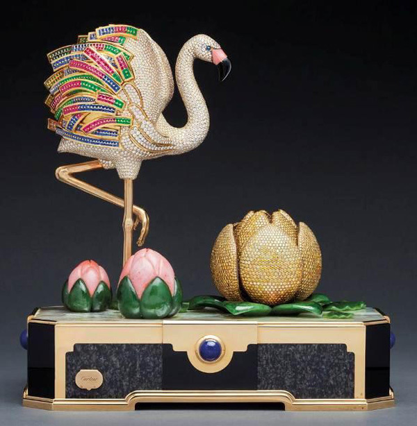 《火鹤与莲花》座台钟,卡地亚,1990年 编号:Lot2535/Sale HK0460 估价:150万-250万港元 成交价:964万港元 拍卖时间:2013年4月7日 拍卖行:香港苏富比 高25cm,宽24.5cm 极绚丽罕有黄金镶钻石、黄钻、蓝宝石、红宝石、祖母绿石、珠母贝、软玉、粉红色硬石、青金石、黑玛瑙及硬石机械装置活动座台钟。石英机芯,银色字环表盘,中央珠母贝的圆形黄金表壳,表圈和表冠镶有钻石。18K黄金方形底座镶有玛瑙和灰色斑点宝石,四个圆形天青石按钮,一个启动莲花机械操作,一个是抽屉里的电源,底座顶部以珠母贝製造,上面有一朵大的黄色镶钻莲花,十片花瓣打开时可看到表盘,软玉叶子,另一边有两朵粉红色宝石小莲花和软玉叶子,镶钻石。另有一头单脚站立的红鹤,镶有钻石,全身羽毛亦镶有正方形彩色宝石和玛瑙。机芯编号81,外壳编号WK900014。