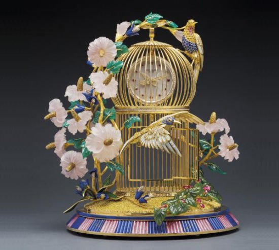 《金丝鸟笼》座台钟,百达翡丽,1992年 编号:Lot2525/Sale HK0460 估价:300万-500万港元 成交价:1036万港元 拍卖时间:2013年4月7日 拍卖行:香港苏富比 高31cm 2068型号博物馆等级举世无双黄金及银镶钻石、蓝宝石、黄宝石、粉红碧玺、珠母贝、粉水晶、玉髓及青金石座台钟。石英机芯,宝石和珠母贝装饰表盘,红宝石时标,黄金镶钻指针,钻石表圈,表盘和机芯装于金鸟笼内顶部,并镶有钻石和黄宝石。球根状的上部边缘镶有钻石,圆桶形鸟笼设有可开启的门,底座镶有黄宝石和钻石,整个鸟笼装于黄金基座上。机芯编号8468,外壳编号2948769。