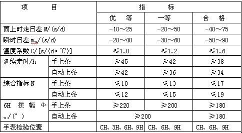 机械手表及其机心的各类型产品的质量水平,除半弦摆幅(6H摆幅Φt24) )的要求外,其走时质量项目及指标应对应符合现行行业标准QB/T 1249-2004《机械手表》表1的规定。